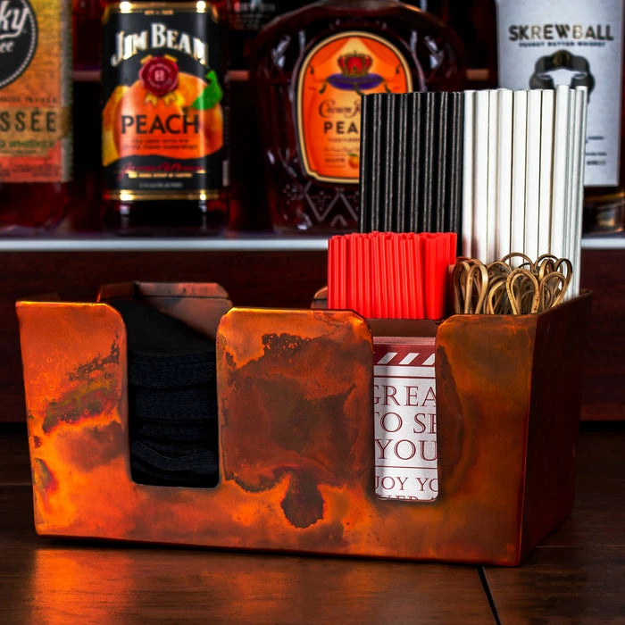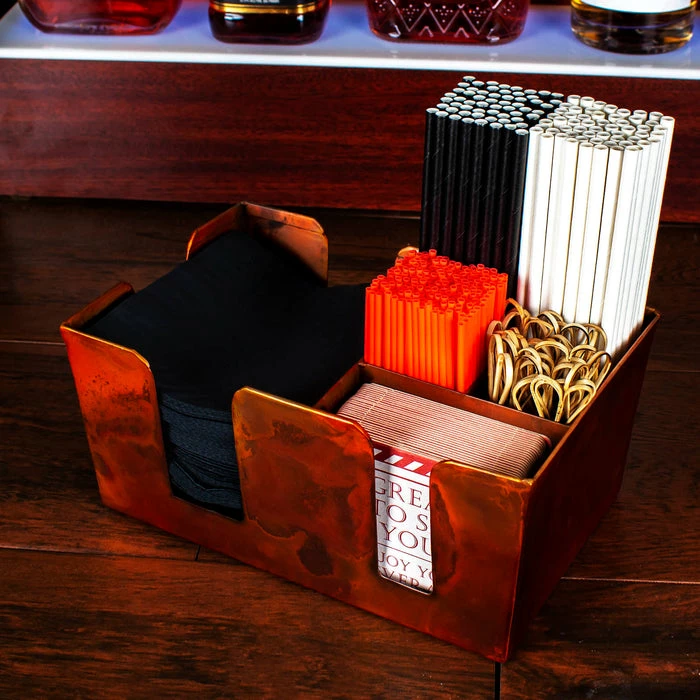 This bar caddy allows you to keep napkins, spoons, straws, sugar packets, and condiments organized. It has a unique antique copper finish that is sure to impress your guest. It is divided into a total of 6 compartments of various sizes. This caddy is 9″ x 6″ and is 4″ high and is perfect for bars or restaurants!