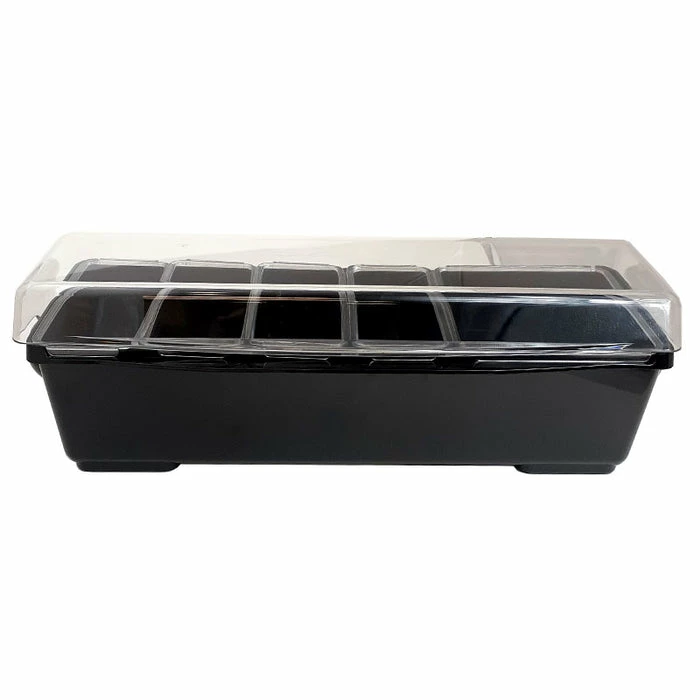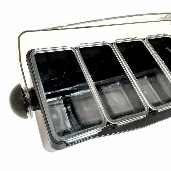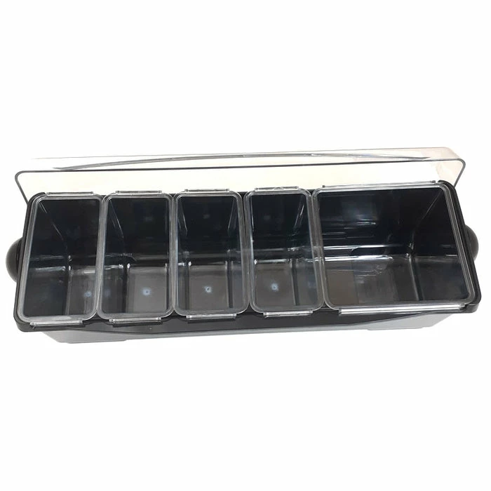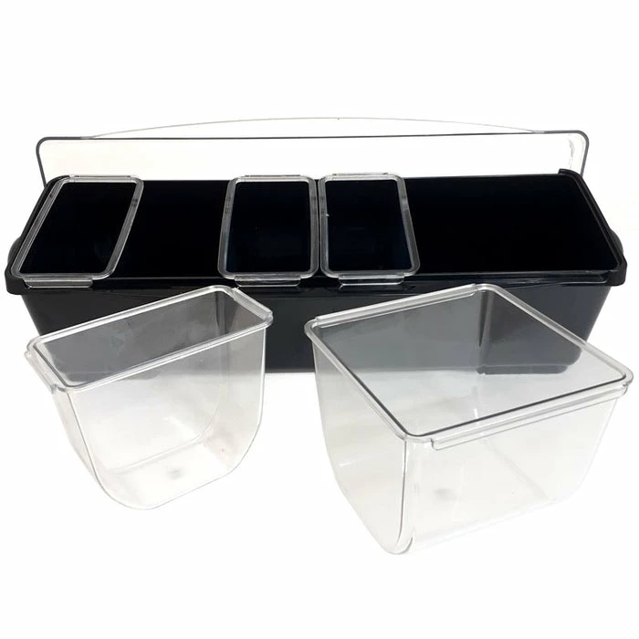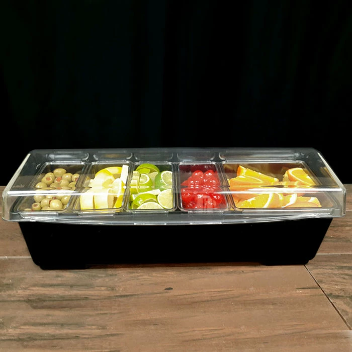 Black plastic bar condiment holder comes with a (2-Quart) and four (1-Quart), hard plastic inserts and has a clear dome shaped lid to see what you need to grab with only a simple glance. The removable inserts allow you to customize your condiment holder to accommodate different garnishes for faster service to your customers. Having the lid can be very useful when storing your garnishes in a fridge or cooler at the end of the night. Easy to use and keep clean. Measures 17 1/2″ L x 7″ H.