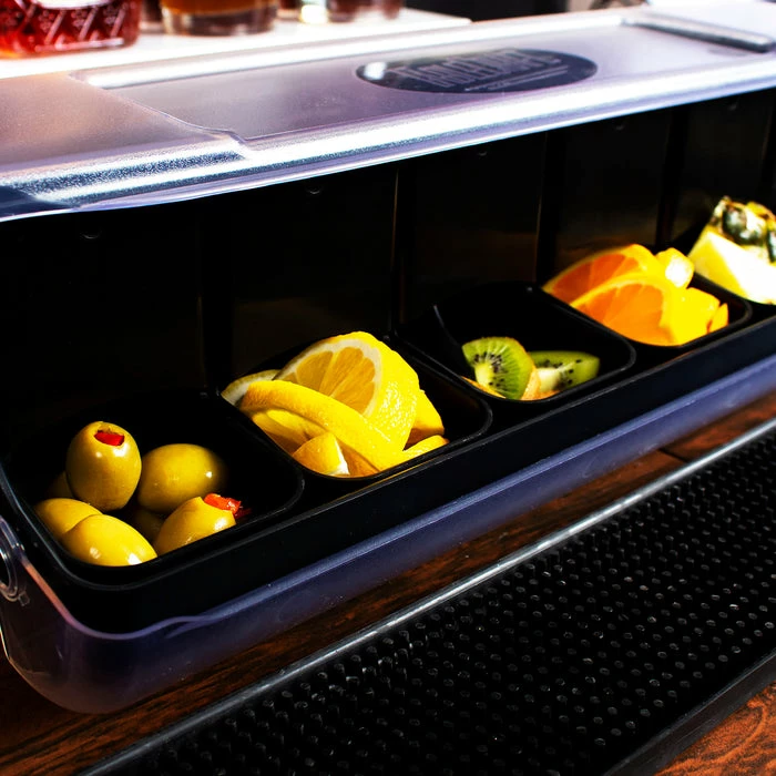 Storing and dispensing fruits and garnishments for cocktails has never been easier. This garnish station features a design where lemons, olives, and other condiments are loaded at the top of the unit and fall down into the wells to be dispensed. This design ensures that the product uses a proper rotation method as it dispenses the oldest product before the newest. It’s perfect for a bar where garnishes are prepared and served on a regular basis. This serving station includes 6 sleeve inserts that can be removed and are dishwasher safe.