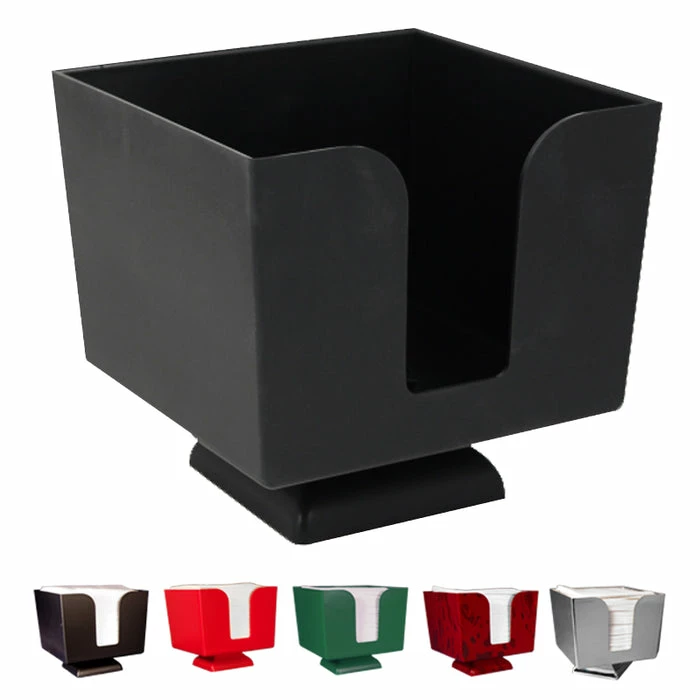 The 3-Way™ Napkin Caddy (patent pending) is made to accommodate all kinds of bar settings with its unique removable base that can be configured to fit this caddy in a corner as well as standard presentation. Measuring 5 x 5 inches, it fits standard cocktail napkins (bev naps) or any bar top cocktail items as needed. We offer them in an array of colors, including chrome and a red marbled pattern.