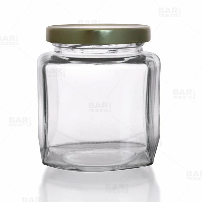 The Oval Hexagon Glass Jar w/ Lid is the perfect container for the master mixologist looking to showcase quality garnishes and ingredients. The glass jar holds up to 9 fluid ounces and is great for storing fresh fruit, herbs, spices, nuts, and any other unique ingredient. The thick glass jar is quality you can see and feel with a brass metal lid.