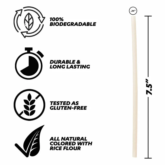 Each straw is made of rice flour, tapioca starch, and plant based ingredients that are flavorless in beverages and tested as gluten-free. Meaning that they are not only good for you but also for the environment. 100% biodegradable breaks down naturally, unlike paper and plastic straws. Designed to last 30+ minutes in cold beverages. So buy a box today and give your customers or guests a new and memorable experience! Measures 7.5”